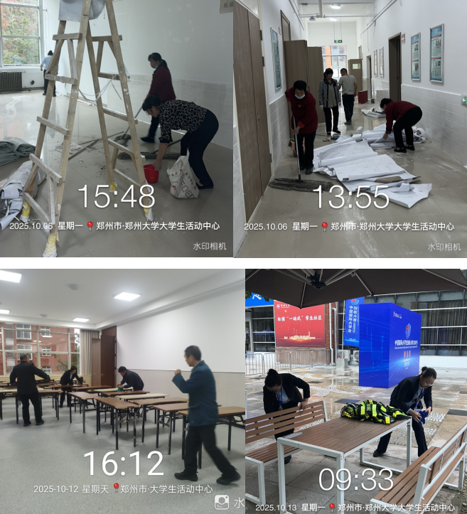 时间紧、任务重、需求紧迫,索克服务郑州大学项目经理高峰第一时间发出“返岗号召”,全体员工迅速结束假期、奔赴岗位,一场与时间竞速的保障战即刻打响。届时,大赛场地大学生活动中心刚完成装修,地面散落着建材碎屑、墙面残留着涂料印记,拓荒保洁工作完全空白;同时,会议室的桌椅摆放、接待室的功能布置、活动现场的区域划分也需同步推进。多项任务叠加,再加上时间紧迫,大赛的物业服务任务艰巨。