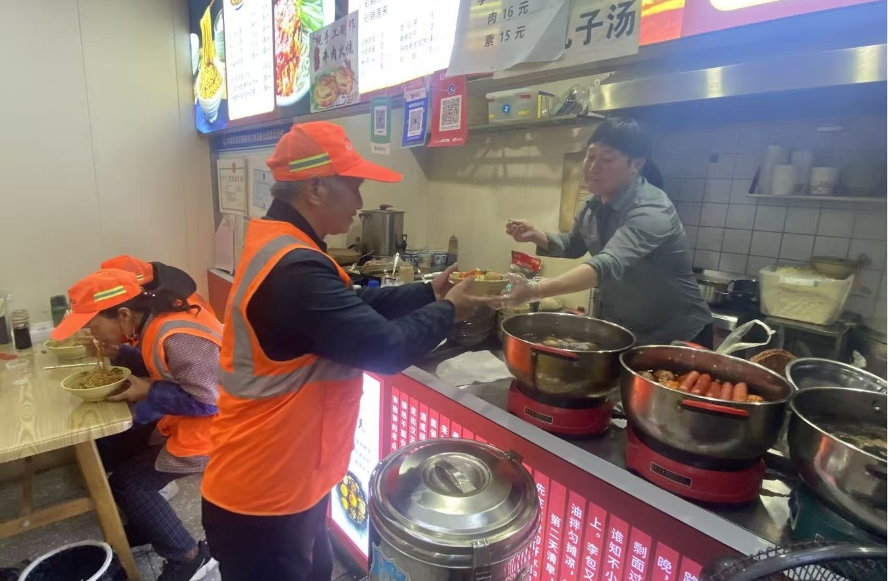 “每天凌晨四点就要上岗,冬天手冻得发僵,夏天汗水能浸透工装,忙活起来根本没时间做饭,这份早餐真是暖到心里了。”接过热气腾腾的早餐,从事环卫工作八年的王国云师傅边吃边说。在中原区汝河街道活动现场,位于工人路沁河路的耀兴隆爱心店铺的志愿者们将备好的热干面、米粥、包子与鸡蛋逐一送到环卫工人手中,热气腾腾的餐食不仅驱散了清晨的凉意,为环卫工人补充了体力,更让常年坚守一线的劳动者感受到被看见、被关怀的温暖。